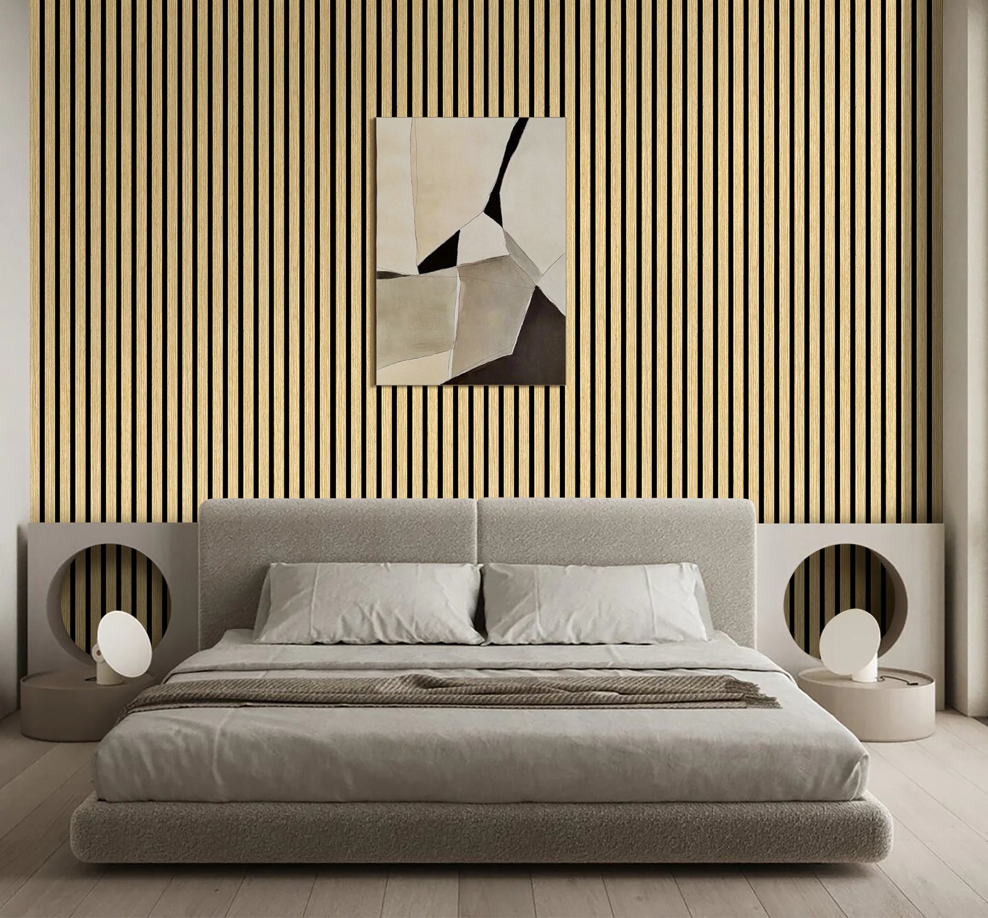 Crafted with sustainability in mind, each panel features a premium wood veneer surface with wider, evenly spaced slats, mounted on a backing of recycled acoustic felt for excellent sound absorption and eco-friendliness. Designed for versatile applications, these panels can be installed on walls, ceilings, and doors, even allowing for a seamless ‘hidden door’ effect.